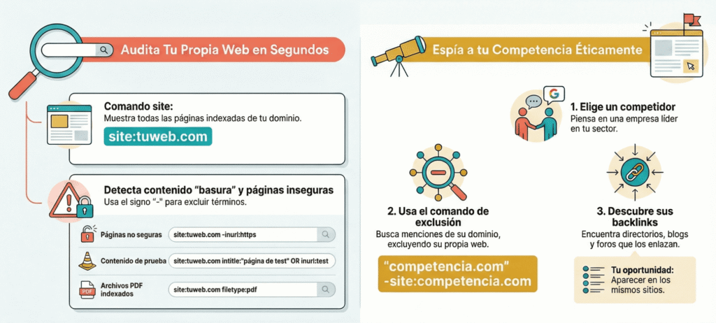 | intitle: | site:tudominio.com intitle:"guía rápida" | Buscar palabras clave específicamente dentro del título de la página. | Canibalización SEO (múltiples páginas compitiendo por la misma palabra clave). | Auditoría técnica |