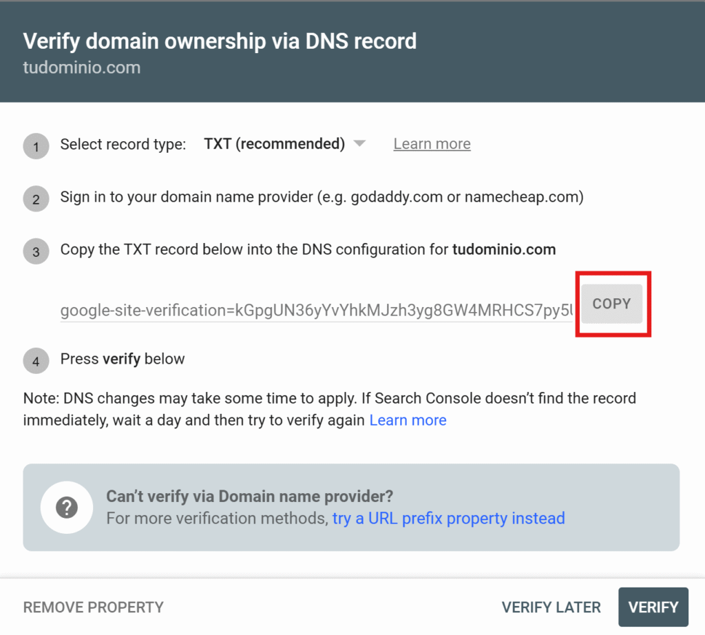1. Copia el registro TXT que te muestra Google.
