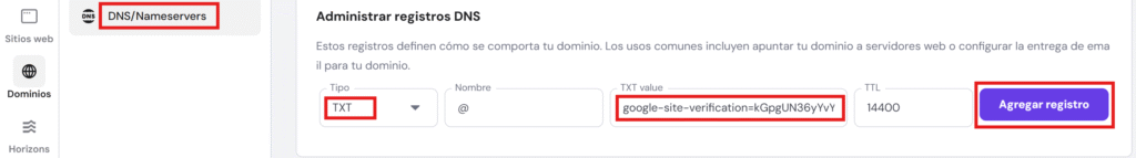Método 1: Propiedad Dominio – Verificación por DNS (el recomendado)