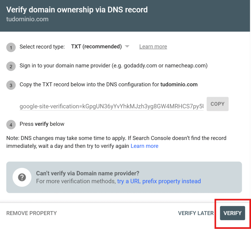 6. Vuelve a Search Console y pulsa Verificar.
