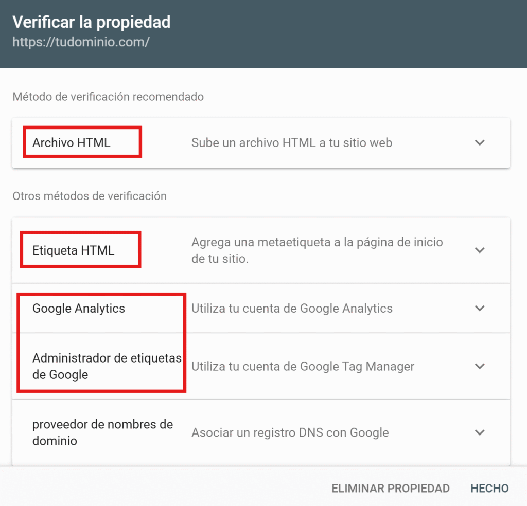 Google te da varios métodos para verificar tu dominio: